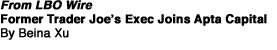 6/17/2010 Wilton, Conn. -- Apta Capital LLC, which launched earlier this year, has brought on former Trader Joe's president Doug Rauch, according to Apta Managing Director John Appel.